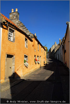 Vorbei an von "National Trust" restaurierten, bunten Häusern aus dem 16. und 17. Jahrhundert stiegen wir durch kleine Gässchen bei strahlender Sonne zur Culross Abbey hinauf. Die Ruinen des Klosters aus dem 13. sowie die Abtei aus dem 17. Jahrhundert mit vorgelagertem Friedhof waren frei zugänglich. Kein Lärm war zu hören, kaum Leute zu sehen; alles war sehr friedlich, fast wie gemalt.