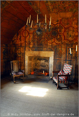 Zurück im Dorf besichtigten wir den inzwischen geöffneten Culross Palace. Erbaut wurde er 1597 - 1611 nicht als Befestigung, sondern als luxuriöses Wohnhaus von George Bruce of Carnock, welcher durch Kohleminen und Salzgewinnung zu Reichtum kam und später zum "Sir" ernannt wurde. Nach einem zehnminütigen, interessanten Videofilm über die Geschichte von Culross gingen wir durch die mit alten Möbeln und Gemälden verzierten Räume, welche nach fortschreitendem Verfall restauriert wurden. Das "gewölbte Zimmer" ist mit bemalten Wand- & Deckenpanelen bestückt, auf denen mehrere Bilder mit geschichtlichen Darstellungen und Sprüchen zu sehen sind. Bei der Restauration versäumte man es, die Bretter zu nummerieren, so dass es Tage dauerte, bis sie wieder in richtiger Reihenfolge angebracht werden konnten.